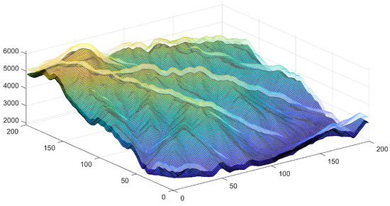 Each complex surface consists of a basic mesh surface G, which consists of sets , with vertices. The height value of each surface is determined by its four vertices . These points are compressed times, and the compressed map becomes , where , and is the average of the data for the range satisfying and . In addition, each grid has a ridge point attribute , which is calculated in the same way as the elevation data. The compressed ridge point attribute is defined as , where it is the average of the data for the range satisfying and . In addition, considering that each face has the ridge point attribute , which is similar to elevation data, the compressed ridge point attribute is correspondingly defined as .