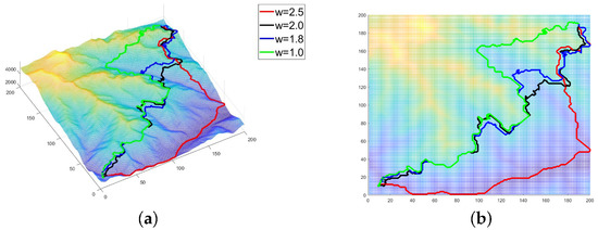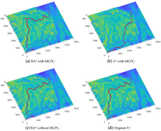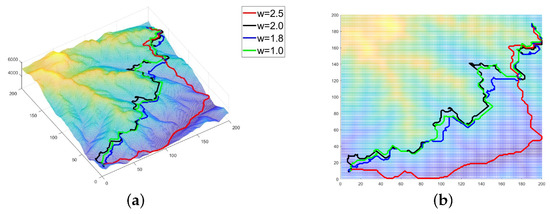 This section describes the experiment on DEM data of 200×200. Figure 10a,b shows that when , the agent will advance along the ridge point as much as possible. A large number of ridge points are observed in the trajectory, which can achieve a good effect of traversing ridge feature points. However, the trajectory does not completely coincide with ridge points, which is limited by the overall cost, and it will make a compromise between them. When , the boundary constraint of the overall cost is greater. Based on the performance of the RA* algorithm, when decreases greatly, the overall trajectory cost will suddenly decrease, and the trajectory shape will change greatly. When decreases slightly, the overall trajectory does not change much, but some details are slightly adjusted. The abovementioned results show that this algorithm is sensitive to the change of , which can adapt to the change of boundary, utilize boundary constraints, and improve the traversal of ridge points as much as possible. When , RA* is equivalent to the original A* algorithm, which is consistent with the same planning result of Dijkstra.