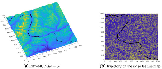 Finally, we show a specific case study on the 2000 × 2000 map (RA*+MCPC with ). Figure 14a on the left shows a planned trajectory. The calculation time is 0.94 s, and the average safety distance is 341 m. Its starting point and ending point are the relative vertices of the square area. Figure 14b on the right shows the characteristic map of ridge points in this area. The yellow area in the map is ridge points, and the black solid line is the corresponding planning trajectory. Based on the two figures, the algorithm proposed in this paper can effectively and simultaneously complete the trajectory planning task and detect ridge points.
