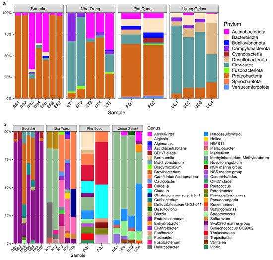 Comparative analysis based on locations indicated that the phylum Proteobacteria comprised the largest proportion of the bacterial communities from the most samples that were collected from Phu Quoc (56.6–59.6%) and Bourake (22.9–97.5%). Additionally, the relative abundance of the phylum Firmicutes displayed a significant increase in the coral bacteriome in Ujung Gelam (ranging from 32.8–79.1%). Similarly, the phylum Campylobacterota (Nha Trang, 32.7%) was found in greater abundance in bacterial communities at this location than at others. At a deeper taxonomic rank, significant variations of relative abundances in some bacterial genera were obtained depending on the coral sampling sites (Figure 1b). The numbers of assigned bacterial genera obtained from Ujung Gelam (276 genera) were higher than those of three other locations, thus demonstrating the higher diversity of bacterial communities at these locations. Endozoicomonas (96.5.%), Fusibacter (66.7%), Candidatus_Actinomarina (39.9%), and Clade_ Ia (23.33%) were the major bacterial genera across coral samples at Bourake, Ujung Gelam, Nha Trang, and Phu Quoc, respectively (Figure 1b).
