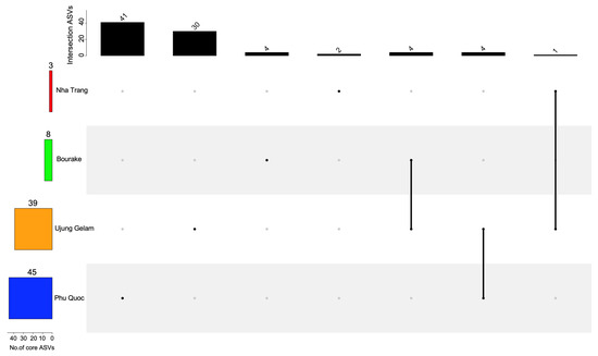 Using the Upset plot (Figure 5), we identified a total of 95 ASVs, which are considered to be the core microbiome across all four sites. Phu Quoc contributed the highest number of coral core microbiome ASVs (45), while the figure for Ujung Gelam was lower, at 39 ASVs, and that for Nha Trang was lowest, at only 3 ASVs. Ujung Gelam had the largest number of shared ASVs, with a total of 9 ASVs (4 for Ujung Gelam and Phu Quoc, 4 for Ujung Gelam and Bourake, and 1 for Ujung Gelam and Nha Trang). Notably, none of the ASVs were shared across all sites.