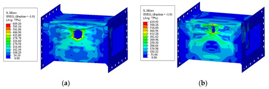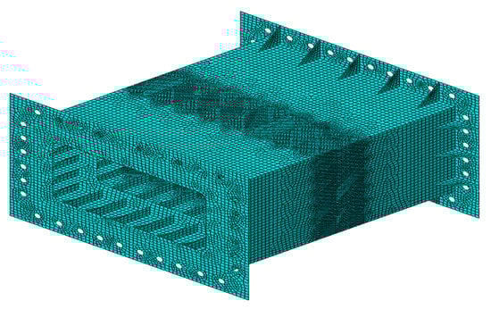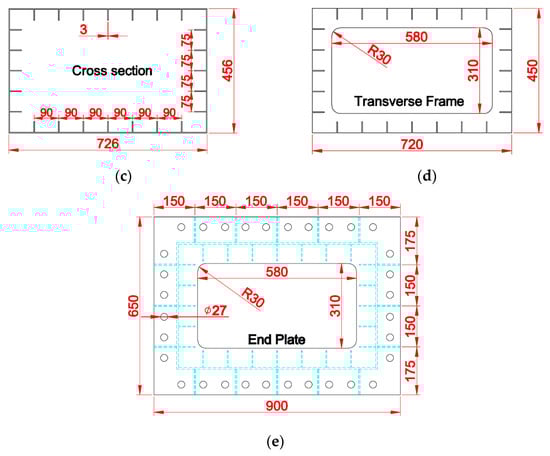 The geometry and cross sections of the models are shown in Figure 1. The box girder models were 726 mm in width, 456 mm in height, and 900 mm in length. The nominal plate thicknesses in the test sections and longitudinal stiffeners were 3.0 mm, and the nominal plate thicknesses for the extension parts and transverse frames were 6.0 mm. End plates with a thickness of 15 mm were welded to the end of the model. In total, there were 24 flat longitudinal stiffeners. The stiffener scantlings were 40 × 3 mm (Group A) and 30 × 3 mm (Group B), respectively.
