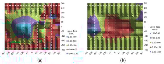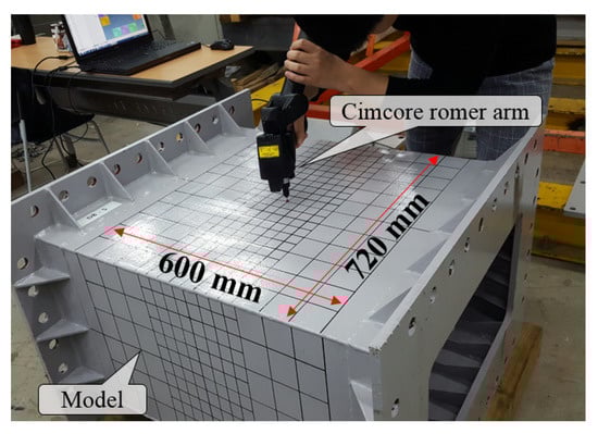 The initial shape imperfections of the fabricated models were measured using a portable measuring arm (Cimcore romer arm), as shown in Figure 2. The error bound of the measured coordinate using the Cimcore romer arm is ±0.075 mm. The grid was plotted to measuring the initial shape imperfection. The size of the grid was 30 × 30 mm in the impact region and 6060 mm in other regions. The measurement results are presented in Table 2. At the surface of the experimental model, the downward direction was assumed to be positive, and the upward direction was assumed to be negative. The results indicated that all ten models had initial imperfections of 1–3 mm. According to the measurement results, a surface chart was made to indicate the initial deformation shape, as shown in Figure 3.