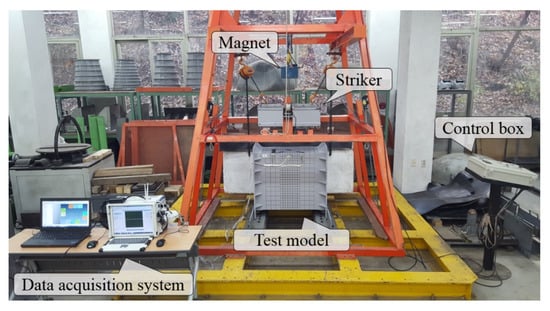 The objective of the collision tests was to generate the denting and fracture damages for the subsequent collapse tests. The damage was induced by using a drop-testing machine, as shown in Figure 4. The test model was moved to a desired position using a chain block. The lower part of the end plates was fixed to the support fixtures clamped to the frame. There was a pulley at the top of the frame tower that guided and held an electromagnet attached to the striker. The drop height of the striker could be varied to achieve the desired impact energy. Once the electromagnetic force was cut off, the striking mass fell and accelerated due to gravity. The tests were divided into two types depending on the damage: denting damage and fracture damage.