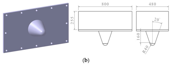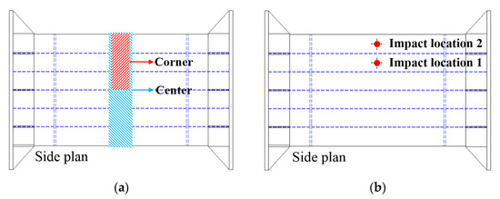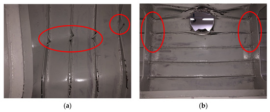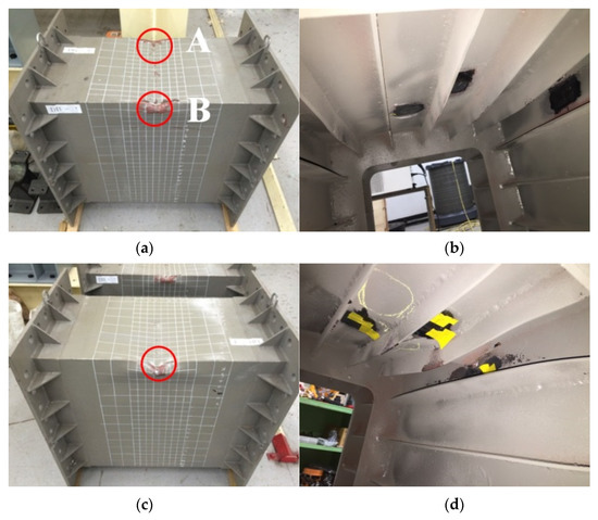 To generate fracture damage, the experiments were performed with a conical header having a hemispherical tip. The striker had a mass of 570 kg, and its dimensions are shown in Figure 5. The test conditions and results are presented in Table 4. The striker for models DB-5 and DB-6 collided at ‘Impact location 1’ and for models DB-7 and DB-8 it collided at ‘Impact location 2’ (Figure 6). The drop height for models DB-5 and DB-7 was 1.9 m and for models DB-6 and DB-8 it was 1.6 m. The diagonal length of the fracture was measured. The deformed shapes of the fracture-damaged models are shown in Figure 8. The box girder models were confirmed to have sustained fracture damage with different fracture shapes depending on the impact location and drop height. The fracture shapes of the model were very complicated. In the case of the gunwale, it was confirmed that a large deformation occurred and propagated up to the deck part. Additional details regarding the collision test results are presented in [27,28].