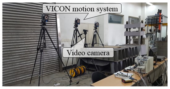 For the bending test, the model was installed on a test jig. Figure 9 shows the four-point bending-test setup with a model in position. A lateral force was applied at the middle of the load-dividing beam using a hand-driven hydraulic pump. The applied load was then divided by the beam. The divided loads were transmitted through the round bars to the inner ends of the extension structures. The test model and extension structures were supported by two round bars at the outer ends of the extension structures. The load applied at the middle of the load-dividing beam was measured by a load cell. The overall dimensions of the test jig are presented in Figure 10. As shown, the distance between each set of round bars was 1350 mm. To measure the model deflection, the distance between the VICON camera and a marker was measured using an infrared sensor (Cho et al. [27]), as shown in Figure 11.