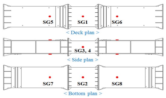 In the bending tests, eight strain gauges were used for each model to measure the strains. Four gauges (SG1-SG4) were attached on the test model, and the other four (SG5-SG8) were on the extension structures, as shown in Figure 12. In this Figure, SG3 is on the collision-damaged side, and SG4 is on the undamaged side. In a four-point bending test, friction occurred at the four supporting points. To estimate the frictional forces exerted on the round bars, four strain gauges SG5, SG6, SG7, and SG8 were attached to the extension structures.