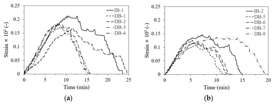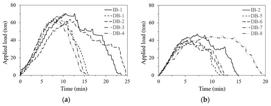 The ultimate strength was reached when buckling occurred at the mid-bay of the box girder models as shown in Figure 13. Figure 13a,b show the collapsed shapes of intact models IB-1 and IB-2, respectively. Figure 13c–f show the collapsed shapes of damaged models DB-2, DB-4, DB-5, and DB-7, respectively. In Figure 14 the deformed shape of the longitudinal stiffener can be seen. The local tripping occurs in the longitudinal stiffeners of the deck. It is also noteworthy that local tripping of the longitudinal stiffeners was apparent at the junctions with transverse frames. The applied load and strain history curves are shown in Figure 15 and Figure 16, respectively. From the load and strain data, the ultimate bending moment and the frictional force were derived. In Table 5, the maximum applied loads obtained from the load-cell are summarized. As the permanent dent depth and fracture damage (diagonal length) increase, the rate of load reduction increases. In the case of Group A, the load reductions of models DB-3 and DB-4, collided at the corner, were greater than models DB-1 and DB-2, collided at the center. In the case of Group B, the load reductions of models DB-5 and DB-6, collided at ‘Impact location 1′, were greater than models DB-7 and DB-8, collided at ‘Impact location 2′. The maximum load of Group A, having higher stiffener web height and stronger yield strength, was greater than that of Group B.