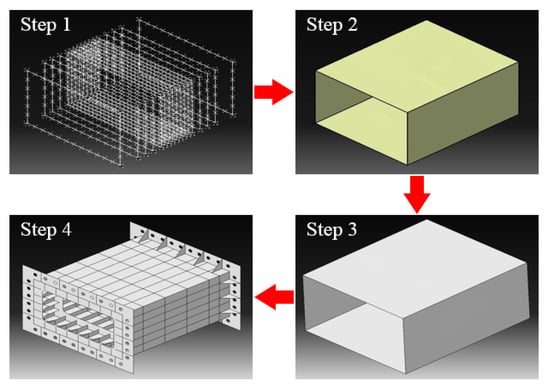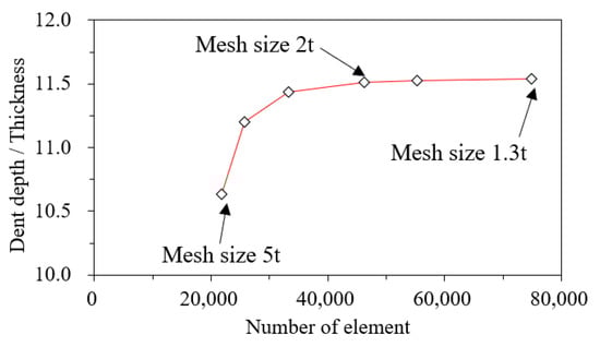 Figure 17 illustrates the FE modeling process. To numerically analyze the experimental model, the initial imperfections were considered. After the measured coordinates of the initial imperfection data were exported to CATIA, the points were connected by the spline function to create a curve (Step 1). Consequently, the surface was created using each curve (Step 2), and the surface of the generated model was exported to ABAQUS (Step 3), where the remaining members were modeled (Step 4). This modeling process was validated by Do et al. [30,31]. The model comprised a four-node shell element (S4R) accompanied with an hourglass regulation and reduced integration, as shown in Figure 18. Five integration points through the thickness were used. To obtain reasonable numerical results and reduce the analysis time, mesh convergence tests were performed. Figure 19 presents the convergence test results. The element size was approximately two times the shell thickness. The impact region of the model was modeled with fine meshes (6×6 mm), and the element size of the coarse mesh far from the impact region was 15 × 15 mm. The total number of nodes and elements were 37,806 and 37,707, respectively.