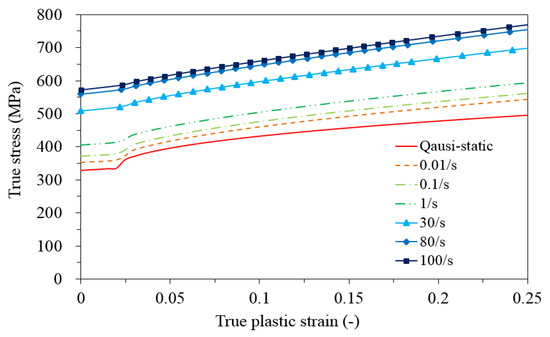 The properties of the strain and strain-rate hardenings of the material were investigated. The tensile-test results were used for defining the material strain-hardening properties. The formula reflecting the dynamic hardening proposed by Cho et al. [34] was obtained using the formula for estimating the yield strength, ultimate tensile strength, hardening start strain, and ultimate tensile strain. The true stress–strain dynamic material curves obtained with the strain rate ε ˙ ( s 1 ) set as 0 (static tensile), 0.01, 0.1, 1, 30, 80, and 100 (dynamic tensile) are plotted in Figure 20.