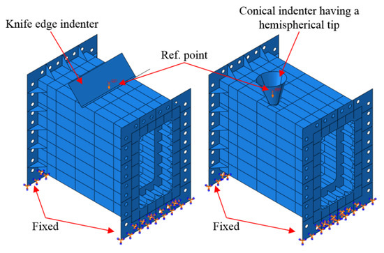 The objective of the collision analysis was to obtain the damaged shapes of the models for the subsequent bending analysis. The simulations were performed by using the nonlinear FE-dynamic explicit tools in ABAQUS. The striker was modeled as a simple rigid body. The mass and impact velocity were given through representative points. Additionally, the modeling was performed with consideration of the actual impact location and tilted striker angle. The boundary condition constrained both the displacement and rotation of the bolts that fixed the model in the actual experiment, as shown in Figure 21.