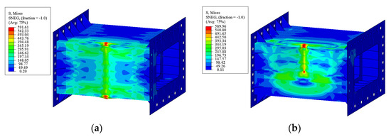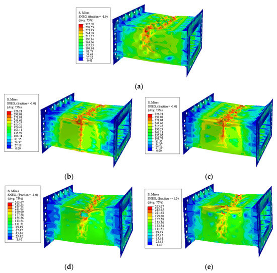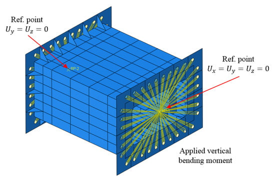 In this study, the bending simulations were performed by modeling the test section only, and the vertical-bending moment was applied to two reference points at the two end sides, as shown in Figure 24. Those reference points were connected to the nodes at the boundary using kinematic coupling so that the section remained flat during rotation. In the bending analyses of the damaged box girder, the damaged model was set as an initial state to consider the residual stress caused by the collision. Figure 25 shows the results of the bending analyses of the box girder model. Figure 25a shows the collapsed shape of the Intact model IB-1. Figure 25b,c show the collapsed shape of the denting-damaged models DB-2 and DB-4, respectively. Figure 25d,e show the collapsed shape of the fracture-damaged models DB-5 and DB-7, respectively. The overall bending mode of the upper deck was observed with the plate buckling. The area initially damaged by collision on the damaged model deepened. This is consistent with the test results.
