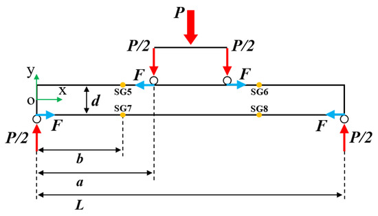 Frictional forces are generated between the model and the supporting structure under a large lateral load. Therefore, the frictional forces were estimated using the strain data. The loading schematic diagram, including the frictional forces between the roller supports and extension structures, is presented in Figure 26, where P represents the applied load at the middle of the load-dividing beam; F represents the frictional force exerted on the roller; a represents the distance between a pair of rollers; b represents the distance between the outer roller and the strain gauge; d represents the web depth of the extension structure; and L represents the distance between the outer rollers.