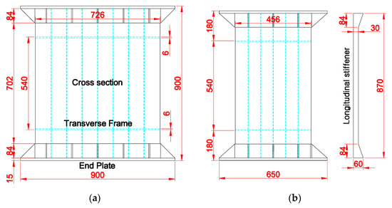 The geometry and cross sections of the models are shown in Figure 1. The box girder models were 726 mm in width, 456 mm in height, and 900 mm in length. The nominal plate thicknesses in the test sections and longitudinal stiffeners were 3.0 mm, and the nominal plate thicknesses for the extension parts and transverse frames were 6.0 mm. End plates with a thickness of 15 mm were welded to the end of the model. In total, there were 24 flat longitudinal stiffeners. The stiffener scantlings were 40 × 3 mm (Group A) and 30 × 3 mm (Group B), respectively.