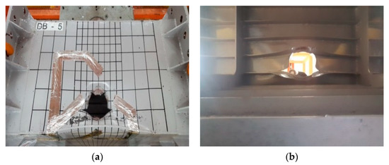To generate fracture damage, the experiments were performed with a conical header having a hemispherical tip. The striker had a mass of 570 kg, and its dimensions are shown in Figure 5. The test conditions and results are presented in Table 4. The striker for models DB-5 and DB-6 collided at ‘Impact location 1’ and for models DB-7 and DB-8 it collided at ‘Impact location 2’ (Figure 6). The drop height for models DB-5 and DB-7 was 1.9 m and for models DB-6 and DB-8 it was 1.6 m. The diagonal length of the fracture was measured. The deformed shapes of the fracture-damaged models are shown in Figure 8. The box girder models were confirmed to have sustained fracture damage with different fracture shapes depending on the impact location and drop height. The fracture shapes of the model were very complicated. In the case of the gunwale, it was confirmed that a large deformation occurred and propagated up to the deck part. Additional details regarding the collision test results are presented in [27,28].