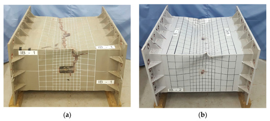 To evaluate the residual longitudinal strength of the box girder structures with denting and fracture damages, ten models were fabricated. The models were divided into two groups, which were denoted as A and B. The parent plates for Groups A and B were ordered separately. Group A comprised one intact model (IB-1) and four denting-damaged models (DB-1, DB-2, DB-3, and DB-4). Group B comprised another intact model (IB-2) and four fracture-damaged models (DB-5, DB-6, DB-7, and DB-8). The box girder models were not scaled down from any actual ships. The tests were designed to analyze the behavior that could be similar to that of the mid-ship section of a ship subjected to a side collision and a vertical bending moment and to validate the numerical method. The denting and fracture damages were generated by performing a lateral collision test.