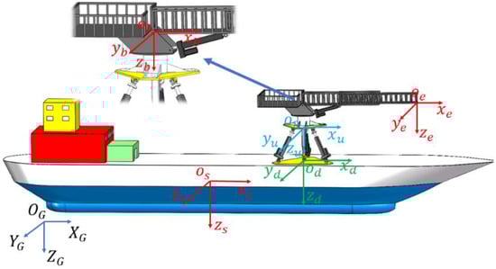 The transfer gangway, which frame is depicted in Figure 3 and Figure 4, is utilized to account for the transfer destination’s three-dimensional displacement with respect to the ship. Section 2.2 provides an explanation of this frame.