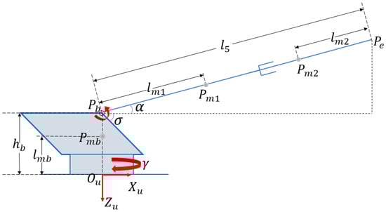 Where indicate the masses of the slewing mechanism, the cylinder of the pitching motor, the rod of the pitching motor, the main arm and the telescopic arm, respectively, , , and indicate the distances of the barycenter of the cylinder of the pitching motor, the rod of the pitching motor, the main arm and the telescopic arm from the pitch axis, respectively. The mass of the equivalent barycenter of the transfer gangway is represented by , and the distance of the equivalent barycenter from the pitch axis is represented by .