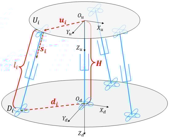 The stable platform’s frame is constructed as shown in Figure 5. The fixed platform and the moving platform are connected by (the hinge point centers of the -th drive support chain) and (the hinge point centers of the stable platform), respectively. The origin is the point at which the drive support chain joins the fixed platform, and the -axis runs parallel to the drive support chain. The vector equation can be obtained:
