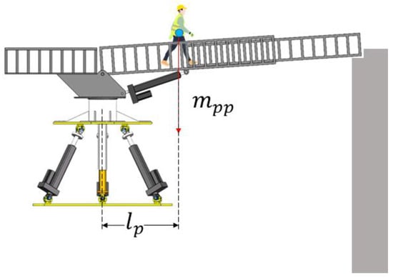When the actual transfer operation is carried out in the offshore gangway, the fixed platform is subjected to the capsizing moment generated during the transfer of personnel (as shown in Figure 8), in addition to the force acting on the platform due to the constant load of its upper members and the dynamic load generated by the transfer gangway for ship motion compensation. Let a person of mass start from the barycenter of the fixed platform and move along the transfer ramp with a speed of ; the distance of the movement is . The dynamics of the system are modeled below in this case.