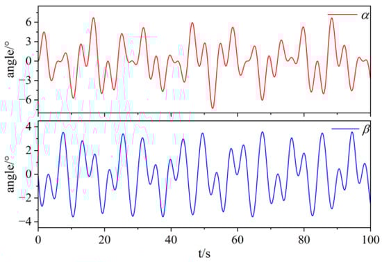 Hence, in Figure 5, the motion revolves around the -axis, and is the roll excitation angle. In Figure 5, —which represents the pitch excitation angle—revolves around the -axis. is the three-dimensional displacement curves of the transit destination relative to the ship.