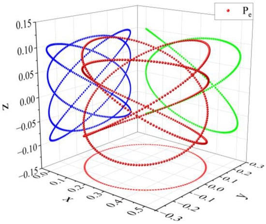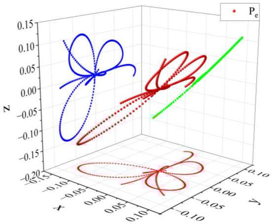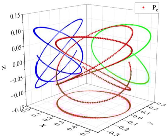 Under the motion excitation in Figure 9 and Figure 10. The response analysis of the end-point position of the gangway with and without compensation control is carried out; the results are shown in Figure 18 and Figure 19, respectively. In Figure 18, the position change of the end point of the gangway without compensation control differs greatly from Figure 10, which proves that the offshore gangway system cannot compensate for the relative displacement of the transfer destination and the end point of the gangway in this case. From the curve in Figure 19, the maximum error of the three-dimensional trajectory curve at the end of the gangway with the three-dimensional trajectory curve in Figure 10 is 0.432 m, 0.433 m and 0.20 m in the x, y, z directions with the maximum error rate of 15.56%, 16.98%, 1.91% in the three directions with compensation control. The curve overlap between Figure 19 and Figure 10 is 83%, which proves that the offshore gangway system can compensate for the relative position deviation between the transfer destination and the end of the gangway through compensating control, and that this ship motion compensation scheme can compensate for 83% of the ship motion compared to no ship motion compensation.