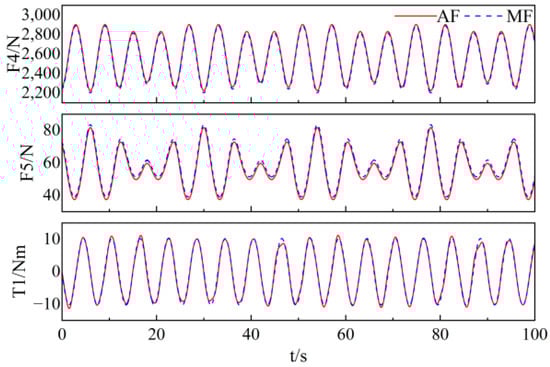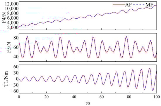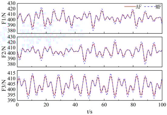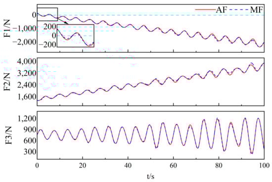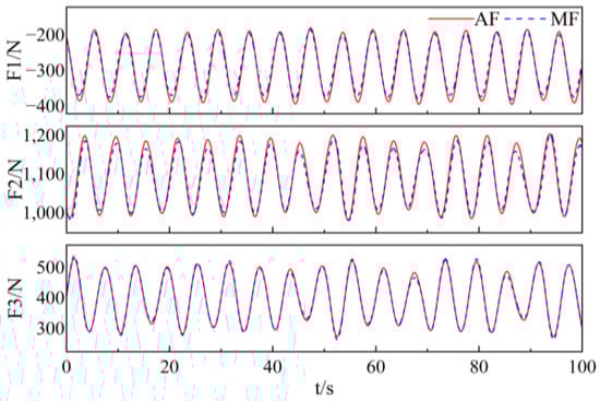 First, the model under static load is calculated and analyzed. In this case, the effect of the transfer gangway on the dynamic load applied to the stable platform is not considered, and the transfer gangway is regarded as part of the fixed platform. In Figure 9, the moving platform receives the addition of and as the motion excitation. Figure 11 illustrates the tractive forces of the three drive support chains that are determined by the dynamic model and simulation. F1–F3 stand for tractive forces of the first, second and third drive support chains, respectively. The tractive force results from the Matlab dynamic model are denoted by MF, while the tractive force output from the Adams simulation is denoted by AF. The two curves in Figure 11 may be seen to be fairly close to one another. The two curves combined maximum inaccuracy under roll and pitch excitation is 0.96%. The tractive forces are generally consistent across periods, verifying the accuracy of the model.