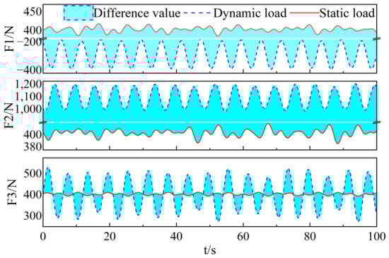 The comparison of the tractive forces of the three drive support chains of the stable platform under static load or dynamic load is shown in Figure 14. It can be observed that the tractive forces of all three drive support chains have changed, among which the tractive force of the first drive support chain is reduced by 52%. The tractive force of the second drive support chain has changed most obviously; it has increased by 283%. The tractive force of the third drive support chain has increased by 26%, indicating that the dynamic load has a great influence on the tractive forces of the drive support chains of the stable platform.
