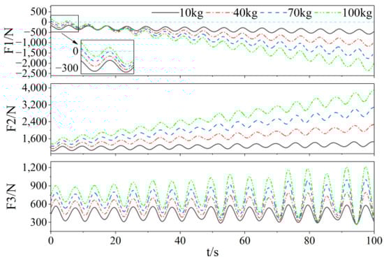 Finally, a calculation and analysis are performed on the model during the actual personnel transfer activity. The individual transferring people will also place a dynamic load on the offshore gangway while it is being used. In Figure 9, the motion excitation is concurrently added to the moving platform as and , whereas in Figure 10, the motion excitation is simultaneously added to the gangway’s end point as . The modeling calculations were performed at of 10 kg, 40 kg, 70 kg and 100 kg, respectively, considering the equipment carried by the person. Figure 15 shows the driving forces of the three drive support chains determined by the dynamic model. It can be seen from the figure that the driving force of the second and third drive support chains increases with increasing mass, the personnel gradually approaches the end of the gangway and the driving force of the first drive support chain changes from positive to negative when the mass is 70 kg, and this phenomenon is more obvious when the mass is 100 kg. Figure 16 and Figure 17 show the traction forces of the three drive support chains determined by the dynamics model and simulation for of 100 kg. The two curves of the figures may be seen to be fairly close to one another. Under dynamic load, the two curves’ combined maximum inaccuracy is 0.75%. The dynamic model’s accuracy is confirmed by the tractive forces’ general consistency throughout time. As the person gradually approaches the end point of the gangway, the tractive force of the first drive support chain changes from positive to negative. The tractive force of the second drive support chain gradually becomes larger and changes obviously. The tractive force of the third drive support chain also gradually becomes larger. The gangway is arranged in parallel with the first and second drive support chains; the third drive support chain is on the opposite side; and the second drive support chain is close to the gangway, so the obtained law is in line with the actual situation.