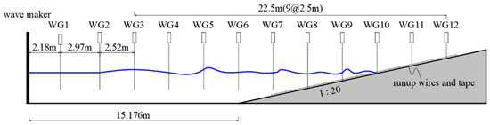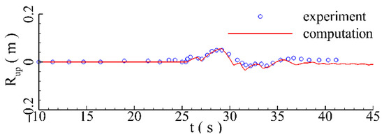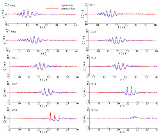 In this section, hydrodynamic processes of the wave generation and transformation of the focused wave group on a sloped beach are numerically simulated. The computed water elevations and wave runup height are validated by the experiment data [61]. Figure 1 shows the experimental layout. The experimental work was carried out in the laboratory flume located in COAST Laboratory at the Plymouth University, UK. The length and width of the wave flume is 35 m and 0.6 m, respectively. A 1:20 sloped beach was installed at the middle of the wave flume. The offshore water depth is 0.5 m. The sloped beach was located at 15.176 m from the wave paddle. Twelve resistance wave gauges were arranged along the flume at 2.5 m intervals to record the temporal and spatial variations of water elevations. The spacing between the first three wave gauges is different slightly, as depicted in Figure 1. The computational domain is also 35 m long. The focusing time () and location () are set as 30 s and 27.676 m. The grid resolution () is kept as 0.01 m in the horizontal direction; 40 -grid layers are used in the vertical direction. Figure 2 shows the time series of water elevations at different wave gauges. Locations of the wave gauges are depicted in Figure 1. It is shown that the computed water elevations are in good agreements with the experiment data. Moreover, it is shown that the present nonhydrostatic flow solver can capture the hydrodynamic processes of the wave generation process in the offshore water region and the subsequent wave transformation on the sloped beach. The skill number proposed by Wilmott [73] is used to evaluate the degree of agreement between the predictions and experiment data. The skill numbers of water elevations at different wave height meters are greater overall than 0.83, verifying that the predicted water elevations match well with the measurements. Figure 3 depicts the temporal evolutions of wave runup height. As shown in Figure 3, the present nonhydrostatic flow solver can well capture the wave runup and descent on the sloped beach. The difference in the peak values for the wave runup height between the prediction and the experiment data is no more than 8%. As mentioned above, the computational capability of the present nonhydrostatic flow solver in predicting the hydrodynamics of a focused wave group has been well validated.