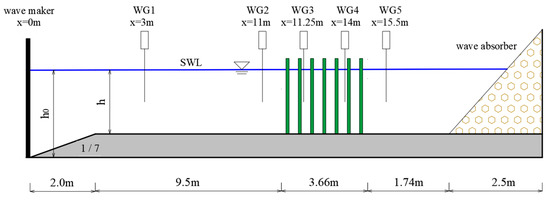 Experiment layout for the wave-vegetation interaction; green piles represent the vegetation patch.