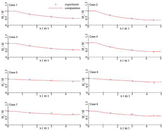 In this section, complicated interactions between the regular waves and emergent rigid vegetation patch are simulated by applying the present numerical wave model. The computed spatial distributions of wave heights are compared with the corresponding experiment data [74]. The physical experiment was carried out in a wave tank at the USDA-ARS National Sedimentation Laboratory (NSL) in Oxford. The experimental layout is depicted in Figure 4. The length and width of the wave flume are 20.6 m and 0.69 m, respectively. In the experiment, the front side of the emergent vegetation model was fixed at 11.5 m from the wave marker. The length of the vegetation patch was 3.66 m. The vegetation model was composed of a wooden cylinder, whose diameter is 9.5 mm. One wave gauge was installed at the front of vegetation patch to record the wave profile of incident waves. Four different wave gauges were laterally distributed along the vegetation patch to record the spatial variations of wave heights. Eight different experimental cases with different wave height, wave period, water depth, and vegetation density were chosen to validate the present nonhydrostatic flow solver. The parameter setups for these eight experimental cases are listed in Table 1. The length of computational domain is 20 m. The grid resolution () is 0.01 m in the horizontal direction. In the vertical direction, 40 -mesh layers are applied. As suggested by Jiang et al. [75] and Qu et al. [63], the drag coefficient () is set as 1.2 for all computational runs. Figure 5 depicts the spatial distributions of the averaged wave heights under different parameter setups. It is seen that the predicted averaged wave height within the vegetation path match well with the experiment data. The skill number proposed by Willmott [73] is used to evaluate the degree of agreement between the predictions and experiment data. All the skill numbers of averaged wave height under all parameter setups are greater than 0.86, indicating that the computational capability of present numerical wave model is reliable and the chosen drag coefficient () is accurate.