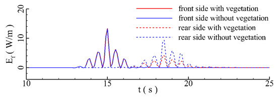 Figure 10 plots the energy fluxes at the front and rear sides of the vegetation patch. Although the temporal evolutions of energy fluxes of the focused wave group with and without the vegetation patch coincide with each other at the front side of the vegetation patch, the peak value of the energy flux of the focused wave group with vegetation patch is much lower than that without the vegetation patch at the rear side of the vegetation patch (57.3% lower), indicating the wave attenuation capability of the vegetation patch. Figure 11 depicts the time series of the different kinds of water wave energies during the runup processes of focused wave groups. It is shown that once the incident waves enter the computational domain, water wave energies gradually increase. At = 10 s, the kinetic energy, potential energy, and the corresponding total wave energy of the water body approach their maximum values. When the focused wave group propagates across the emergent vegetation patch (15 < < 20 s), attributed to the significant wave damping effects of the vegetation patch, the kinetic energy, potential energy, and total wave energy of the water body can be reduced by 48.5%, 56.5%, and 51.1%, respectively, compared with the focused wave group without the vegetation patch.