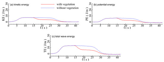 Due to the complicated wave–vegetation interactions, different types of wave energies can be dissipated and transferred. Similar to Qu et al. [72], the potential energy (), kinetic energy (), and total energy () can be calculated as