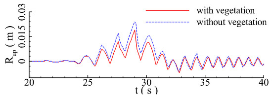 Figure 12 plots the time series of the wave runup height for the focused wave group with and without the vegetation patch. As depicted in Figure 12, the temporal evolution of the wave run height is basically consistent with the temporal evolution of the focused wave profile. Attributed to the wave damping effects of the vegetation patch, the maximum value of the wave runup height of the focused wave group with the vegetation patch is about 22.0% lower than that without the vegetation patch. This further illustrates the damping effects of the emergent vegetation patch on the runup processes of the focused wave group. Through the above analysis, it is shown that the existence of the emergent vegetation patch has great effects on the hydrodynamics of wave runup processes of a focused wave group on the sloped beach. The presence of a vegetation patch can greatly reduce the wave runup height of extreme waves and effectively protect the coast.