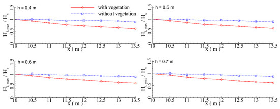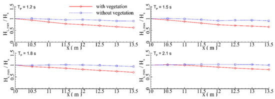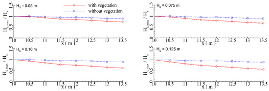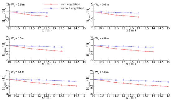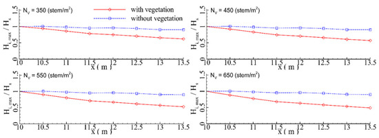 where represents the local maximum wave height at rear side of the vegetation patch when the vegetation exists. represents the local maximum wave height at the rear side of the vegetation patch when the vegetation path does not exist. In this study, the local wave height is defined as the local crest-minus-trough of the wave groups.