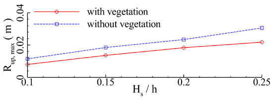 This section discusses the influences of the emergent vegetation patch on the runup processes of focused wave groups under different significant wave heights. Figure 13 depicts the spatial distributions of local maximum wave height within the vegetation patch under different significant wave heights. When the vegetation patch is absent, the local maximum wave height of the focused wave group can only slightly decrease because of the bottom friction and the wave profile evolutions. Once the vegetation patch is present, the local maximum wave height of the focused wave group will be significantly decreased. Moreover, difference between the local maximum wave height between the focused wave groups with and without the vegetation at the rear side of the vegetation patch gradually increases with the significant wave height. Figure 14 depicts the variation in decreasing rate of the local maximum wave height at the rear side of the vegetation patch with the significant wave height. It clearly shows that the decreasing rate of the local maximum wave height linearly increases with the significant wave height. As the relative wave height () increases from 0.1 to 0.25, decreasing rate of the local maximum wave height increase by 19.0%. Figure 15 depicts the variation in wave energy dissipation rate with the significant wave height. When the incident waves propagate within the vegetation patch, most of the incident wave energy can be dissipated. Wave energy dissipation rate gradually increases with the significant wave height. When the relative wave height () increases gradually from 0.1 to 0.25, the wave energy dissipation rate increases by 25.6%. Figure 16 depicts the variation in maximum wave runup height with the significant wave height. Maximum wave runup height almost increases linearly with the significant wave height. Since the presence of the vegetation patch can dissipate a great portion of the incident wave energy, the maximum values for the wave runup height of the focused wave group with the vegetation patch are smaller, 25% smaller on average, than that without the vegetation patch.