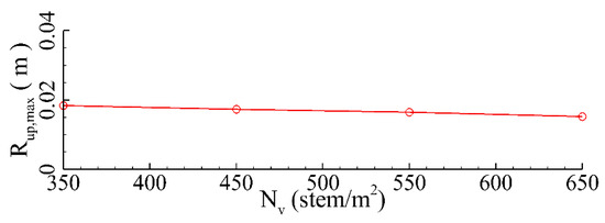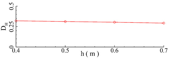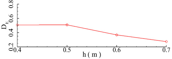 Influences of the emergent vegetation patch on the runup processes of focused wave groups under different water depths are presented in this section. Figure 17 shows the spatial distribution of local maximum wave height within the vegetation patch. Because of the frictional force at the bottom and the wave evolution process, the local maximum wave height of the focused wave group without the vegetation can only slightly decrease along the vegetation patch. When the vegetation patch is present, the local maximum wave height will decrease obviously when the focused wave group propagates within the vegetation patch. However, the decreasing rate of the local maximum wave height gradually slows down with the increasing of water depth. Figure 18 plots the variation in the decreasing rate of the local maximum wave height at rear side of the vegetation patch. As shown in Figure 18, the decreasing rate of the local maximum wave height only slightly decreases in a linear mode with the water depth. As the water depth () increases from 0.4 m to 0.7 m, decreasing rate of the local maximum wave height at rear side of the vegetation patch can only decrease by 2.8%. The variation in the wave energy dissipation rate with the water depth is plotted in Figure 19. When the water depth is less than 0.5 m, the dissipation rate of the wave energy is almost a constant and can only be slightly influenced by the water depth. Once the water depth () is greater than 0.5 m, the dissipation rate of the wave energy sharply decreases with the water depth at a high rate. As the water depth () gradually increases from 0.5 m to 0.7 m, the dissipation rate of the wave energy decreased by 23.5%. In the case of a given significant wave height, the increase in the water depth will increase the effective wavelength of the incident waves, which will lead to a gradual decrease in the magnitude of wave-induced water velocity. Finally, the energy dissipation rate is decreased. Figure 20 shows the variation in maximum wave runup height with the water depth. Given the significant wave height = 0.1 m, the maximum wave runup height can only slightly decrease with the water depth. As the water depth () gradually increases from 0.4 m to 0.7 m, the maximum wave runup height of the focused wave group with and without the vegetation patch can be decreased by 22.6% and 22.0%, respectively. Attributed to the damping effects of the emergent vegetation patch, maximum wave runup height of the focused wave group with the vegetation patch are always smaller than that without the vegetation patch, 21.5% smaller on average, under different water depths.