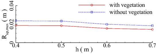 - Given the specific significant wave height, the increase in the water depth will increase the effective wavelength of the incident waves, which will lead to a gradual decrease in the magnitude of wave-induced water velocity. Then, the energy dissipation rate decreases. Hence, the maximum wave runup height tends to slightly decrease with the water depth. As the water depth increases from 0.4 to 0.7 m, the maximum wave runup height of the focused wave group with and without the vegetation patch can be decreased by 22.6% and 22%, respectively.