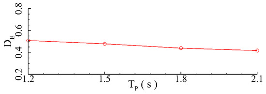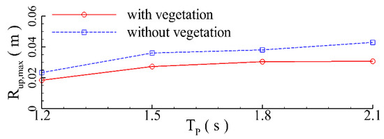 This section analyzes the influences of the peak wave period on the wave attenuation of focused wave groups by the emergent vegetation patch. Figure 21 shows the spatial distributions of the local maximum wave height within the vegetation patch. Apparently, the local maximum wave height of the focused wave group tends to decrease along the emergent vegetation patch. Due to the extra drag force of the emergent vegetation patch, local maximum wave height of the focused wave group with the vegetation patch is always smaller than that without the vegetation patch. However, differences in the local maximum wave height of focused wave groups with and without the vegetation patch tend to decrease with the peak wave period. Figure 22 shows the variation in the decreasing rate of the local maximum wave height at the rear side of the vegetation patch with the peak wave period. As depicted in Figure 22, the decreasing rate of the local maximum wave height monotonically decreases with the peak wave period. As the peak wave period () gradually increases from 1.2 s to 2.1 s, decreasing rate of the local maximum wave height decreases by 12.8%. Given the significant wave height and water depth, the increase in peak wave period will enlarge the effective wavelength of incident wave components, resulting in a gradual decreasing in the magnitude of wave-induced water velocity. Hence, the energy dissipation rate decreases with the peak wave period, as depicted in Figure 23. As the peak wave period () increases from 1.2 s to 2.1 s, the wave energy dissipation rate of the focused wave group with the vegetation patch decreases by 9.2%. As depicted in Figure 24, the maximum wave runup height monotonically increases with the peak wave period. As the peak wave period () increases from 1.2 s to 2.1 s, the maximum wave runup height of the focused wave group with and without the vegetation patch increases by 40.1% and 45.6%, respectively. Attributed to the damping effects of the emergent vegetation patch, maximum wave runup height of the focused wave group with the vegetation patch are always smaller than that without the vegetation patch, 23.6% smaller on average, under different peak wave periods.