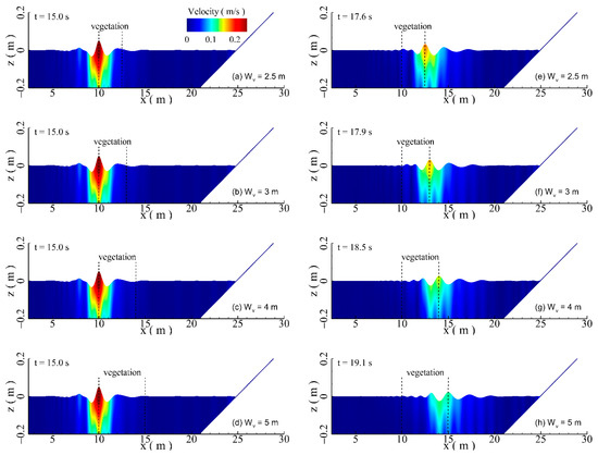 Complicated interactions between the focused wave group and the emergent vegetation patch and the influences of the emergent vegetation patch on the runup processes of the focused wave group are discussed in this section. Snapshots of the water velocity contours at different time moments are plotted in Figure 7. When the wave components with different wave parameters enter the computational domain, the wave profile of the focused wave group is to evolve (Figure 7a,g). High-velocity water region can be found near the peak wave crest. The incident waves are designed to focus on the front side of the vegetation patch (Figure 7b,h). Attributed to the wave attenuation effects of the vegetation patch, the peak wave crest can be significantly reduced, compared with the focused wave group without the vegetation patch (Figure 7c,i). Meanwhile, the velocity magnitude of the water body can be also greatly decreased. After the transmitted wave group leaves the vegetation patch (Figure 7d,e), the reshaped wave group is run up along the sloped beach and finally results in a lower maximum wave runup height (Figure 7f).