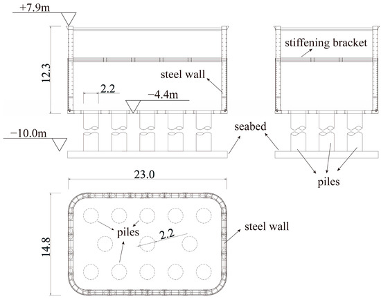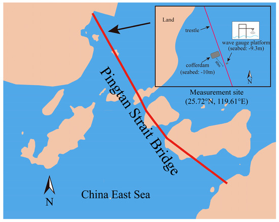 Pingtan Strait Bridge is a 16.2 km long rail-road sea-crossing bridge in the China East Sea, connecting Fuzhou city and Pingtan Island, as shown in Figure 1. Due to the opened northeast offshore, the waves propagating from the northeast caused by cyclone may threaten the bridge under construction. For analyzing the impact of the destructive waves on construction of the bridge, a temporary cofferdam is taken for the on-site measurement, of which cross-sections are sketched in Figure 2. The thin-walled steel cofferdam locates at 25.72° N, 119.61° E, of which dimensions are 23.0 × 14.8 × 12.3 m. Below the cofferdam, 13 reinforced concrete piles with diameter of 2.2 m are used for supporting, and all of them are fixed on the seabed whose altitude is −10 m. The top and the bottom altitudes of the cofferdam are +7.9 m and −4.4 m, respectively.