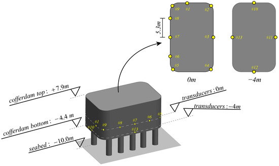 For the hydrodynamic pressure measurement, thirteen CSW560 type pressure transducers are deployed around the cofferdam for the random wave pressures. The measurement range of the transducers is 0–200 kPa and the margin of error is within 0.5%, which is sufficient for the pressure measurement. Setup of the transducers is drawn in Figure 3. Among those transducers, nine of them, i.e., #1–#9, are deployed at altitudes of 0 m for capturing the wave pressure around the still water level (SWL), and the rest four transducers of #10–#13 are deployed at altitude of −4 m.