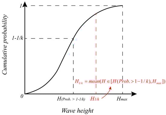 Firstly, from the wave surface elevation time history, the wave heights can be extracted with the zero up-crossing method which is commonly used in many studies [22,23,24], and the period corresponding to each wave height is recorded. Then the probability density function (PDF) can be approximated by kernel density estimation (KDE), and the cumulative distribution function (CDF) can be further obtained by integration of the PDF, which indicates the probability of wave height lower than the specified value. Similar to the significant wave height, defining the average wave height of the greatest waves (Harish and Baba, 1986) as the statistical indicator for the wave height, which can be simply derived from the CDF as shown in Figure 4. A greater usually yields the less frequently encountered , and when , the denotes the significant wave height . With respect to the wave period, each corresponds to the which equals the average period of those greatest waves. In addition, the average wave height and period are also obtained.