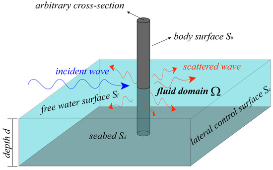 When the lateral size of structure is closed to the incident wavelength, the scattered waves induced by diffraction are non-negligible and considerable, which will be superposed to the incident waves and eventually yield a new stable wave field. The fundamental problem of diffraction is shown in Figure 5, in which the fluid domain with the water depth is incompressible and inviscid. With the free surface at the top, flat seabed at the bottom, and the lateral control surface , the fluid domain can be considered as a closed control volume. A rigid structure with an arbitrary cross-section (e.g., the cofferdam introduced above) is mounted on the seabed, of which body surface is denoted as .