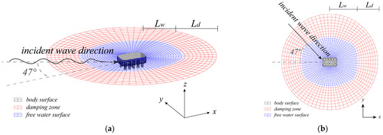 where is the damping coefficient; denotes the distance to the origin; is the starting point of the damping zone; and are wave frequency and wavelength, respectively; and are the custom parameters defined by user, which is able to alter the damping behavior and is usually defined as 1 [25]. With such an approach, a damping zone whose performance acts like a sort of beach is constructed to hinder the wave motion and eliminate the reflection from the lateral control surface, and thus the lateral control surface can be excluded from the boundary surfaces to simplify the computation. With inserting the damping coefficient Equation (8) into Equations (5) and (6), the free surface boundary conditions in the damping zone can be expressed as