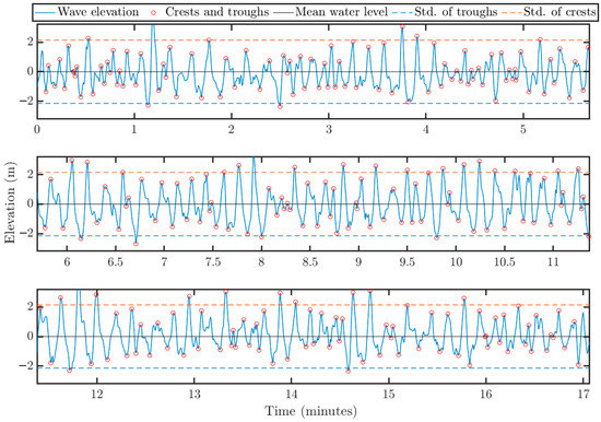 As introduced in Section 2, the wave surface elevation was measured by the wave gauge, of which result is shown in Figure 7. According to the result, about 17 min of wave elevation was recorded, and for sake of conciseness, the mean elevation is zeroized. The crests and troughs are marked with red circles, of which standard deviations (Std.) are given by the dash lines.