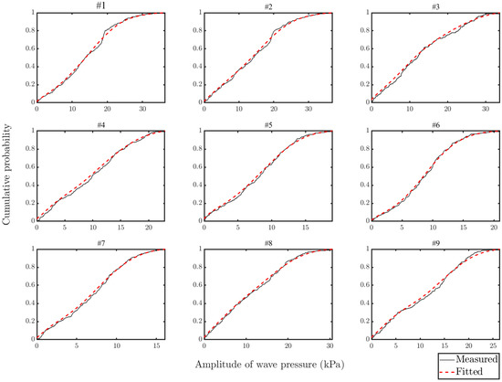 For presenting the wave pressure measurement results concisely, instead of the large amount of the original measured data, the CDFs for wave pressure amplitudes of the transducers are shown and fitted with Rayleigh’s distribution in Figure 9 and Figure 10. Among the CDFs, #1–9 are the results for the transducers located at the altitude of −2.37 m and #11–13 show the results for the altitude of −6.37 m.