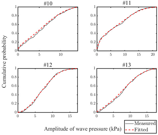 The wave pressure spatial distribution comparison using the representative wave method and the statistical indicators exactly shows the differences between the TDBEM prediction and the on-site measurement. Still, the comparison in probability distribution is necessary for presenting the differences in greater detail, which is able to show the difference in pressure amplitudes at each probability level. With the CDF of the measured wave height, the CDFs of the predicted pressure amplitude can be derived, and the comparison between the measured and the predicted CDFs can be carried out, as shown in Figure 13 and Figure 14.