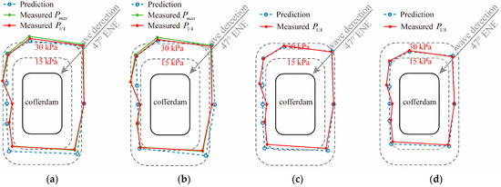 Similar to the wave height, the amplitude of wave pressure is extracted from the measured data, and the CDF of amplitude is obtained then. The maximum pressure and the , i.e., average pressure amplitude of the greatest amplitudes, are defined as the statistical indicators for the wave pressure, which is derived from the measured pressure and the CDF, respectively. Note that the analysis and comparison between the measurement and the prediction by TDBEM require the hydrodynamic wave pressure, thus the original measured wave pressure containing the hydrostatical component needs to be subtracted by the still water pressure according to the measured sinking depth of each transducer. In addition to the pressure, the wave direction also plays a dominant role in the prediction and comparison, which was measured by the time sequence that the transducers reach the peak pressure and it was found to be about 47° of the east–northeast.